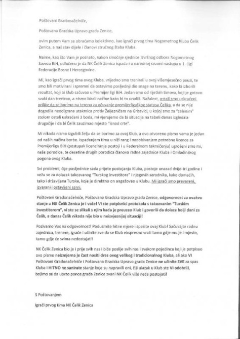 Fudbaleri Čelika su poslali pismo gradskim vlastima Zenice povodom situacije u ovom klubu i ispadanja u niži rang takmičenja.