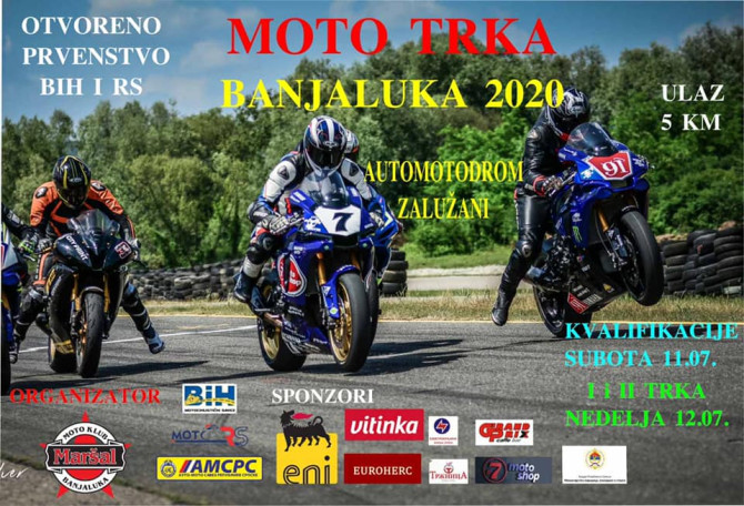 Otvoreno prvenstvo Bosne i Hercegovine i Republike Srpske u kružnim moto-trkama "Banjaluka 2020",nakon što je odloženo zbog pandemije virusa korona, biće održano 11. i 12. jula na autodromu u Zalužanima kod Banjaluke, saopšteno je na zvaničnoj FB stranici Moto savez BiH.