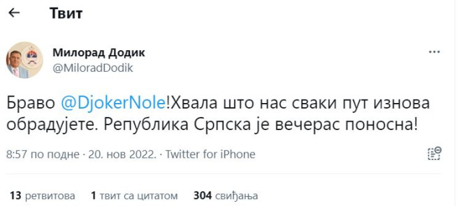 - Upućujem Vam najsrdačnije čestitke povodom velikog uspjeha koji ste ostvarili na završnom Masters turniru u Torinu. Sjajnom igrom tokom cijelog turnira i fantastičnom pobjedom u finalu pružili ste, kao mnogo puta do sada, neizmjerne trenutke radosti i sreće, te obradovali brojne ljubitelje tenisa i sve Vaše vjerne navijače u Republici Srpskoj - naglasio je Dodik u čestitki.