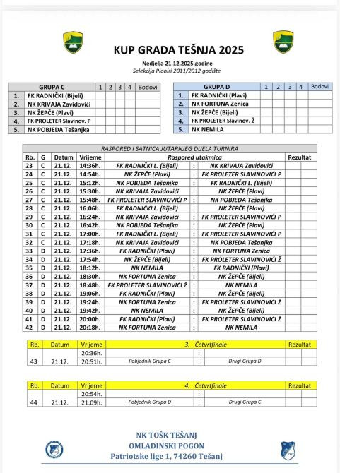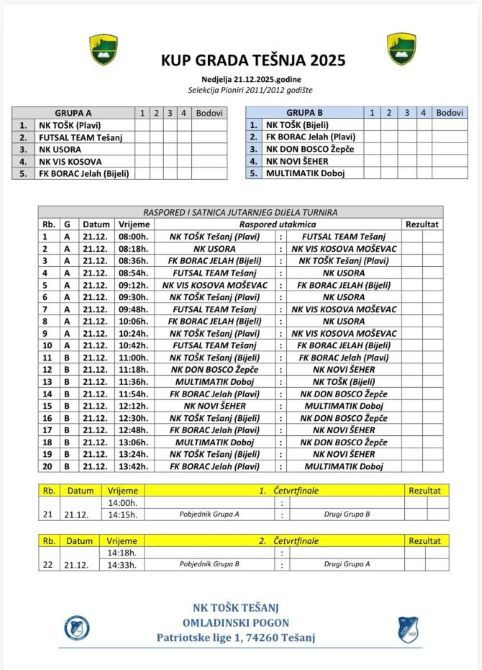 U nastavku donosimo grupe, kompletan raspored utakmica i satnicu turnira za kategoriju pionira.