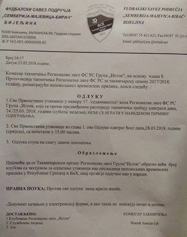 Zbog loših vremenskih uslova i snježnih padavina odloženo je kompletno kolo, pa će se sve utakmice 17. kola igrati u srijedu, 28.marta.
