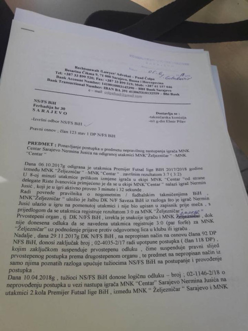 MNK Željezničar uložio je juče, tačno mjesec dana od završetka prvenstva, žalbu Savezu na odluku donesenu povodom utakmice koja je igrana 4. oktobra prošle godine između MNK Željezničar i MNK Centar.