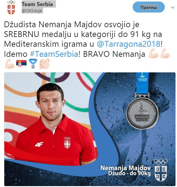 Srpski džudista Nemanja Majdov osvojio je srebrnu medalju na Mediteranskim igrama u Taragoni.